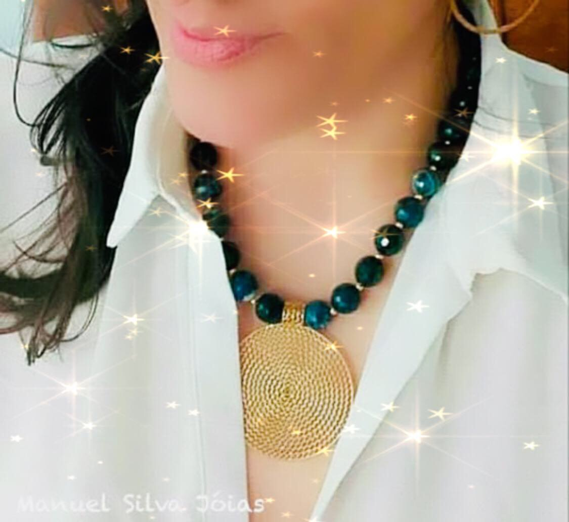 Colar em prata dourada ou prateada com pedras verdes.
