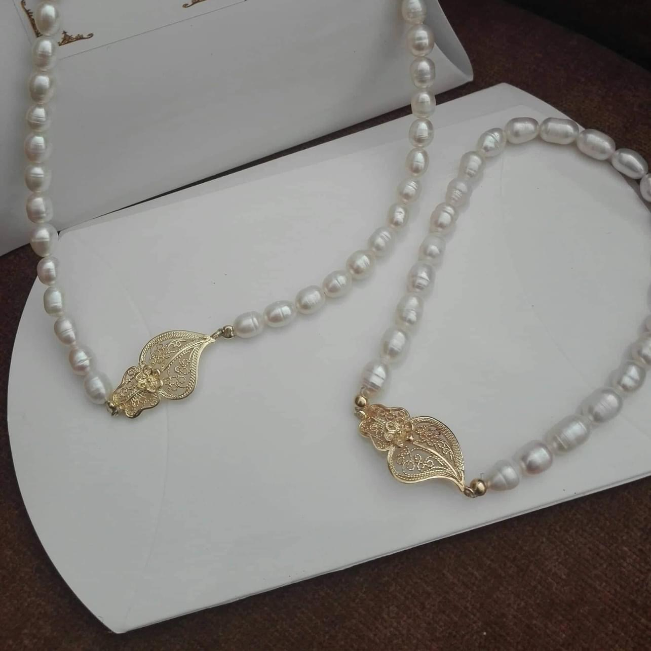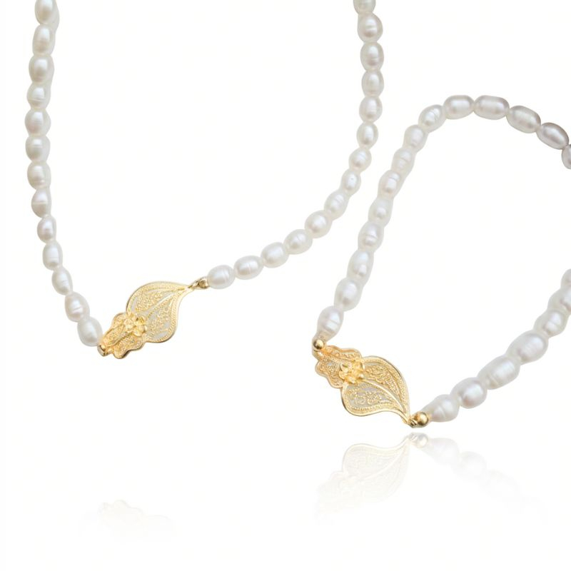 Conjunto com pérolas com coração de filigrana em prata dourada ou prateada.