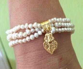 Pulseira de pérolas com coração de filigrana em prata dourada ou prateada.