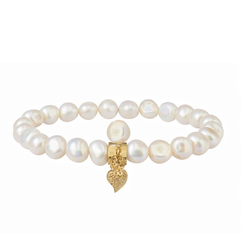 Pulseira com pérolas com coração de filigrana em prata dourada ou prateada.