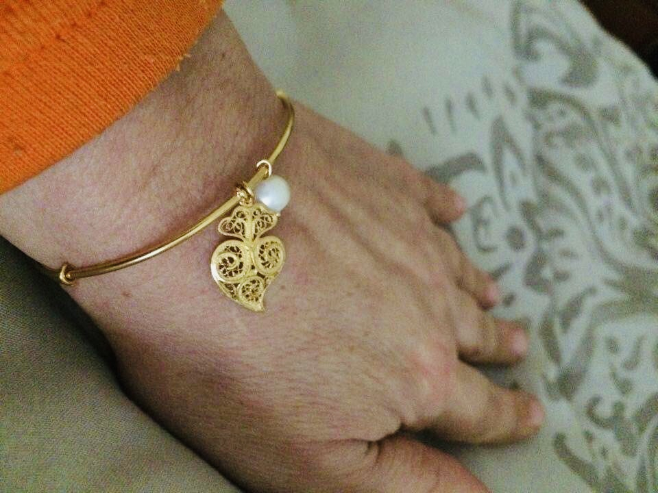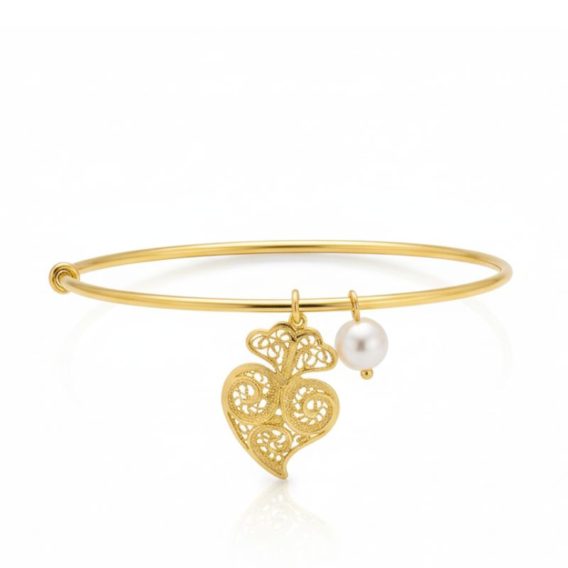 Pulseira com coração de Viana em filigrana em prata dourada ou prateada com pérola.