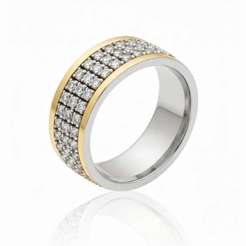 Aliança em ouro 9k e prata 925 com zircónios. Rotativa ou fixa.