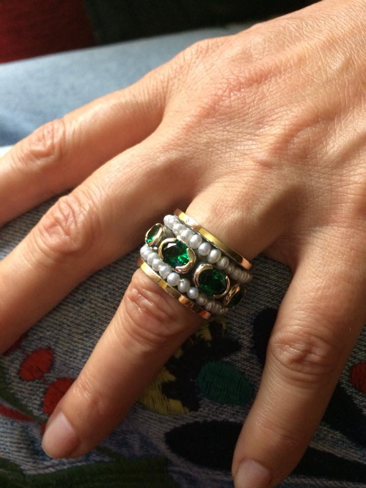 Aliança em ouro e prata com pedras verdes e pérolas. Faço com outras cores de pedras.
