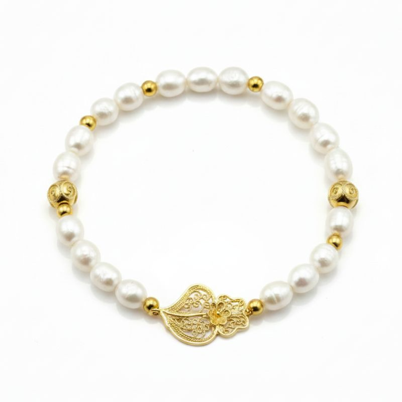 Pulseira de pérolas com coração de filigrana em prata dourada ou prateada. Tenho o anel, o fio e os brincos de conjunto