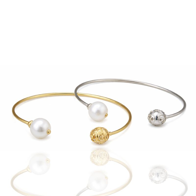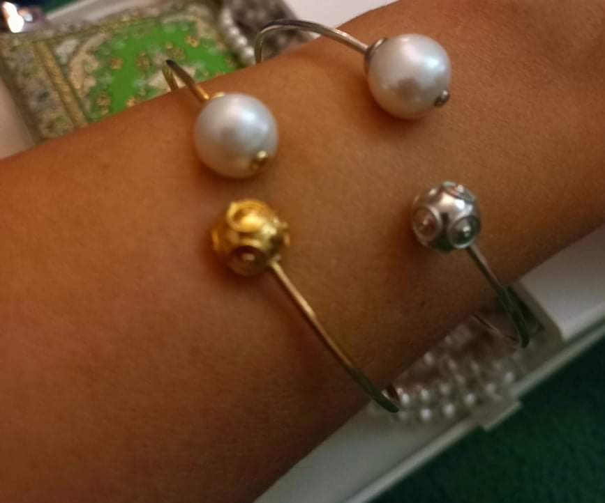 Pulseira em prata dourada ou prateada com conta de Viana e pérola.